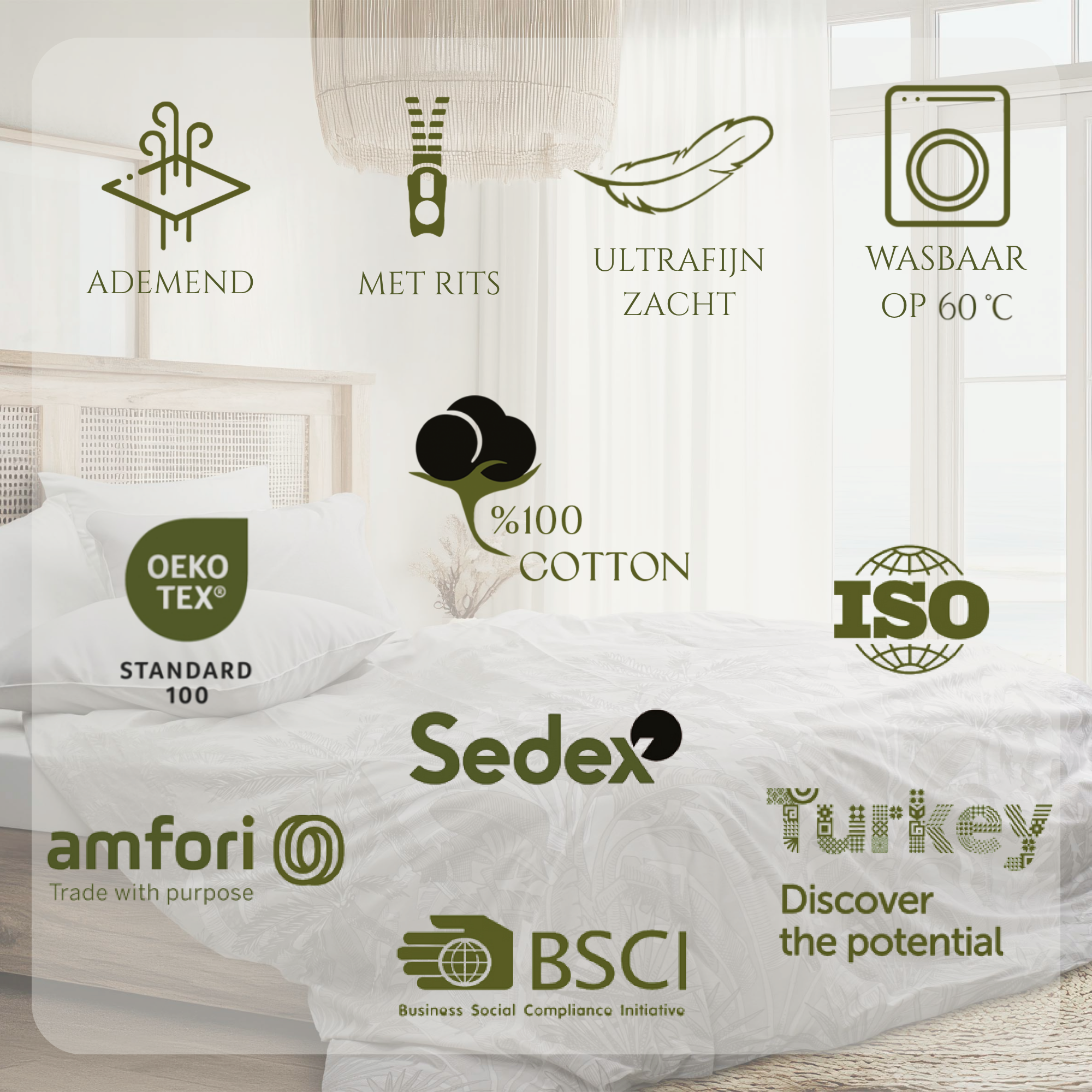 Onze dekbedovertrekken worden gemaakt van 100% premium Turks katoen en dragen het OEKO-TEX certificaat, wat betekent dat ze vrij zijn van schadelijke stoffen.