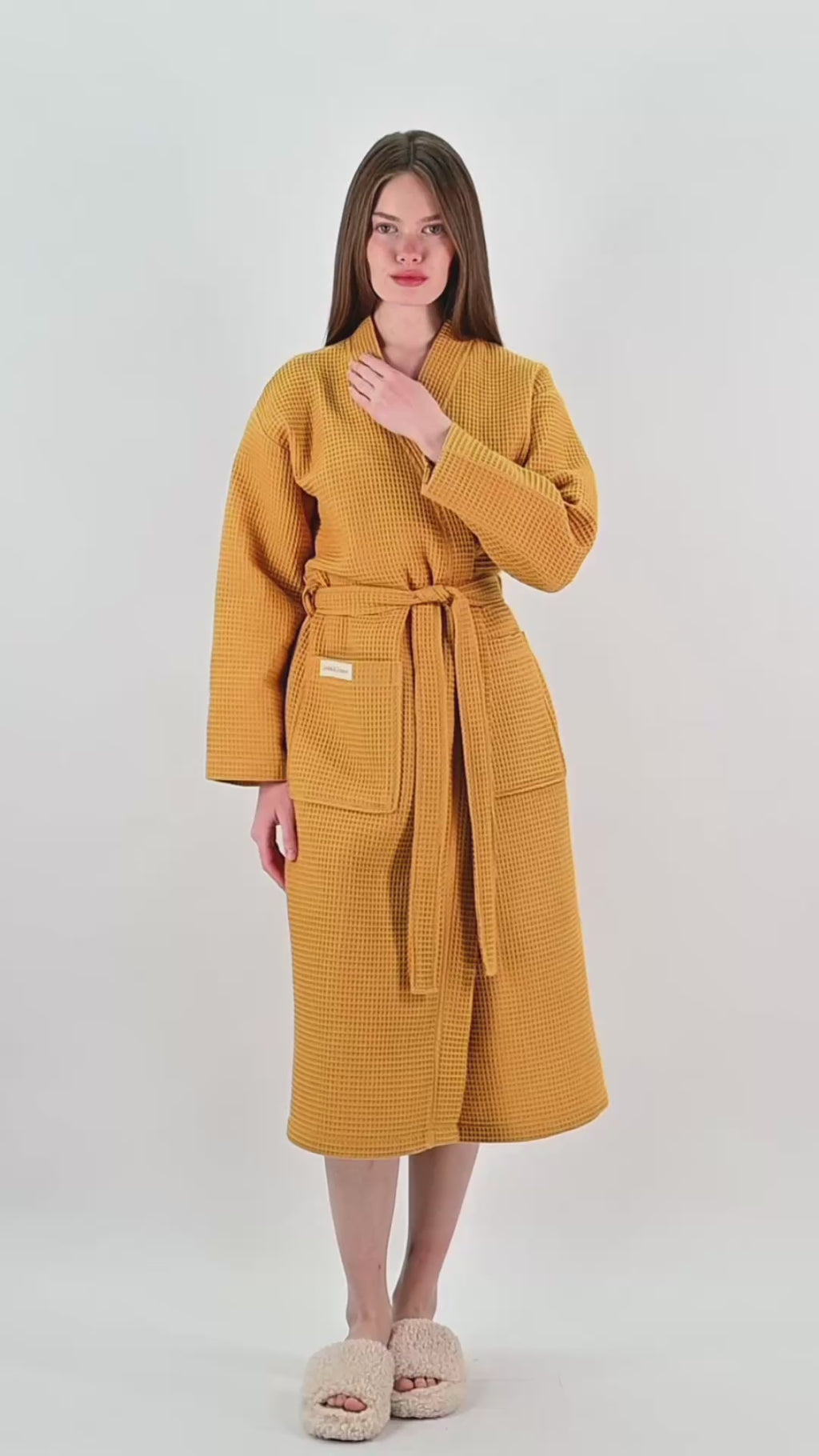 Het wafelpatroon zorgt voor een zachte en comfortabele aanraking, plakt niet aan de huid en droogt snel. De badjas is voorzien van twee handige zakken, een ceintuur en een lusje in de kraag om hem gemakkelijk op te hangen.