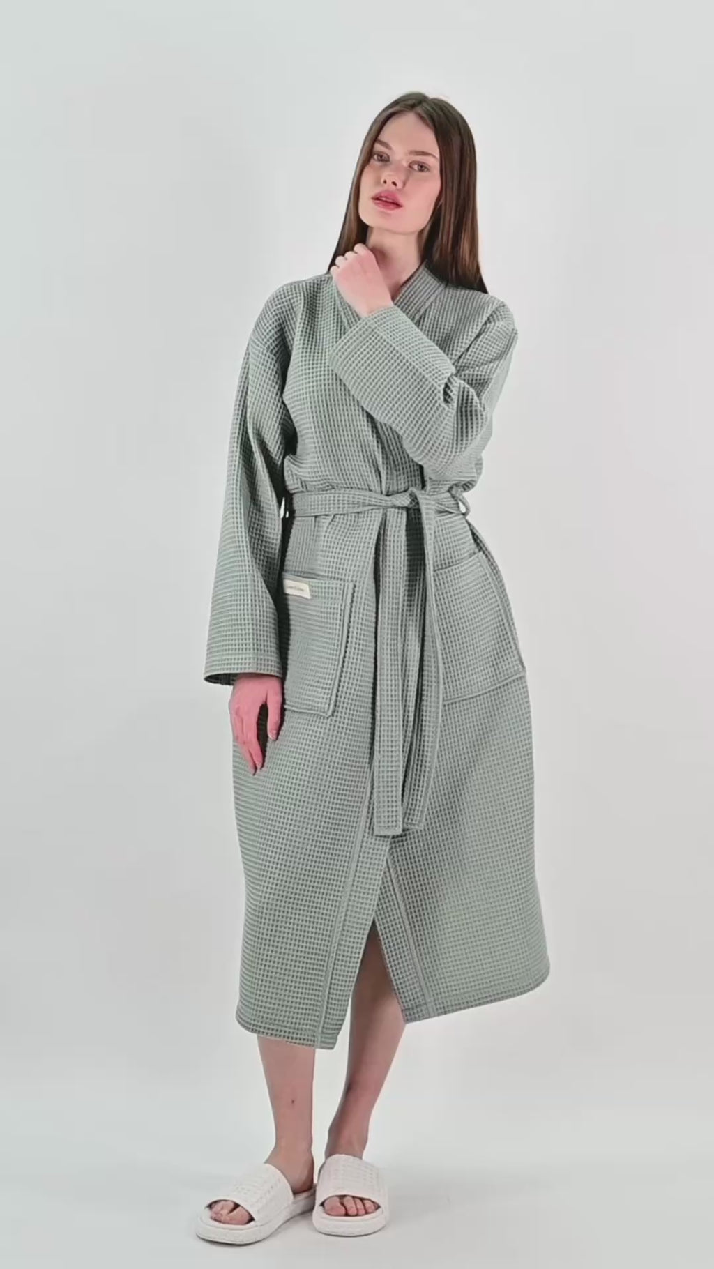 Het wafelpatroon zorgt voor een zachte en comfortabele aanraking, plakt niet aan de huid en droogt snel. De badjas is voorzien van twee handige zakken, een ceintuur en een lusje in de kraag om hem gemakkelijk op te hangen.